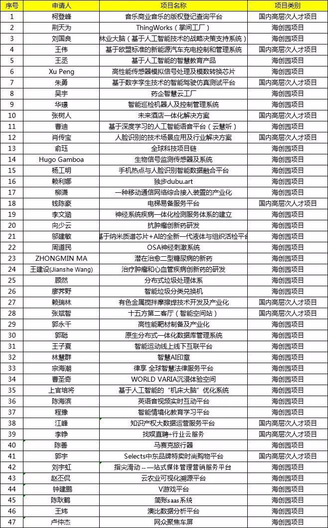 根据《浙江海外高层次人才创新园项目评审管理办法》(杭科(创)管〔2014〕105 号)、《余杭区国内高层次人才创新创业项目扶持管理办法(试行)》(余政办〔2017〕71号)规定,经项目征集、资格审查、项目初审、评审答辩,通过浙江杭州未来科技城(海创园)管委会审定,共47个项目通过评审。