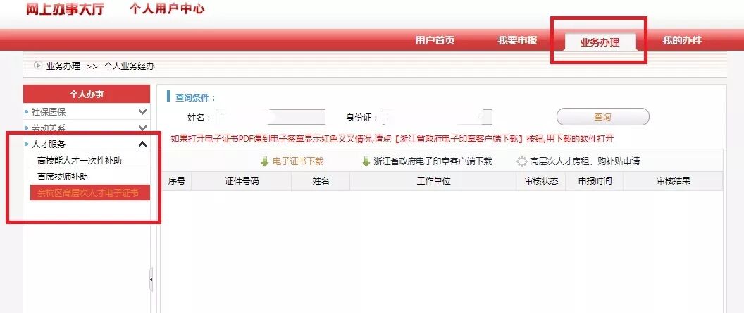 选择业务办理→人才服务→余杭区高层次人才电子证书