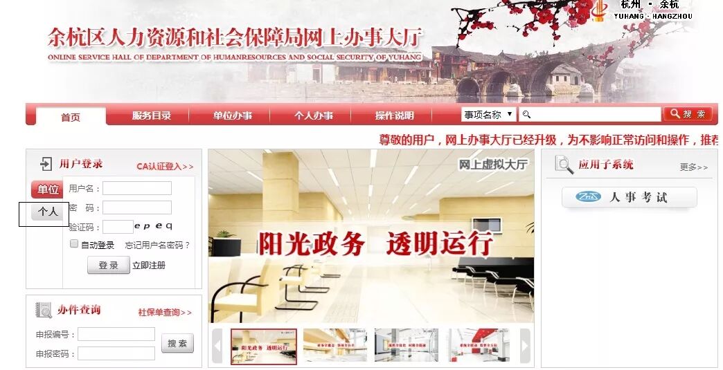 申请人登录余杭区人力资源和社会保障局网上办事大厅 http://60.191.35.28:8080, 个人用户登录→进入用户中心 。